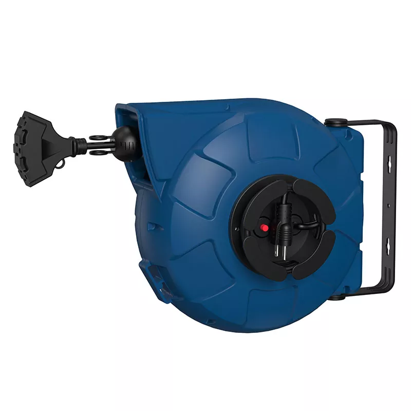 壁取り付け用のスチール製ブラケット、頑丈なプラスチック製ハウジング、実用的な持ち運び用ハンドル:電動ケーブル リールは理想的なケーブル延長です。